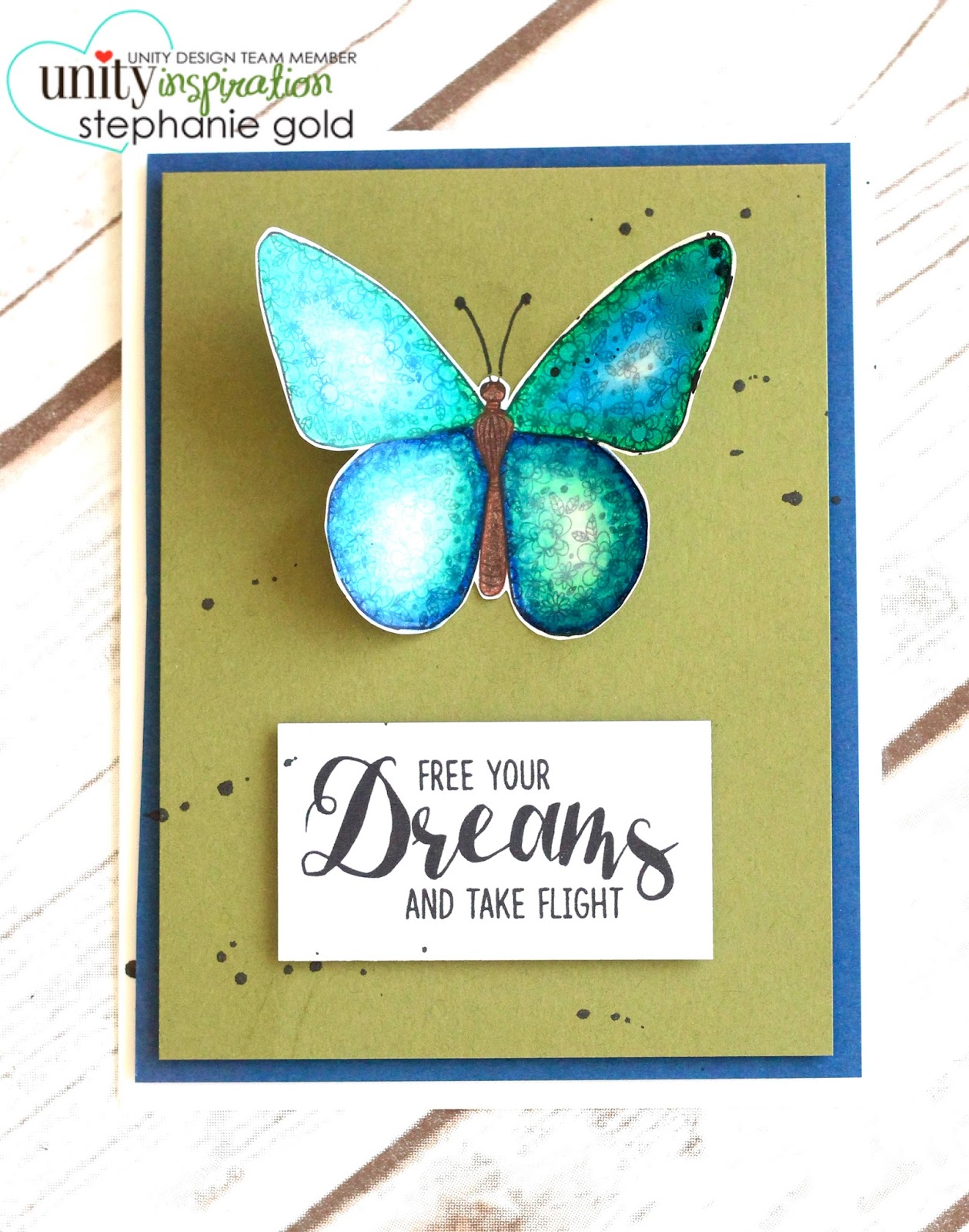 I accented my butterfly with some blue and green cardstock panels and finished the card off with black paint splatters.